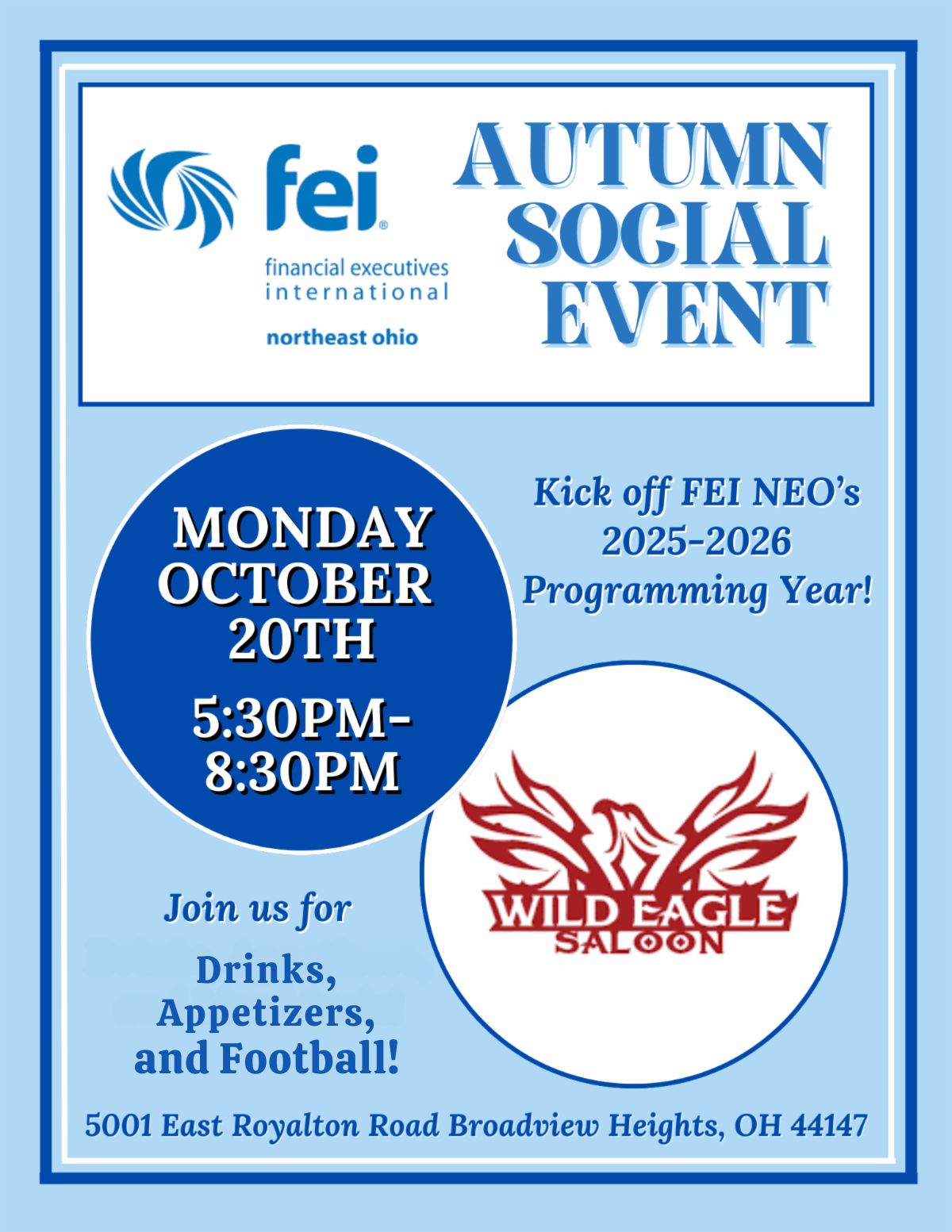 Join us on Monday, October 20th, from 5:30–8:30 PM at Wild Eagle Saloon in Broadview Heights for an evening of drinks, appetizers, and Monday Night Football. Don’t miss this chance to reconnect, make new connections, unwind, celebrate the new season, and enjoy Monday Night Football with your fellow members and Strategic Partners! Free for FEI NEO Chapter members and Strategic Partners.